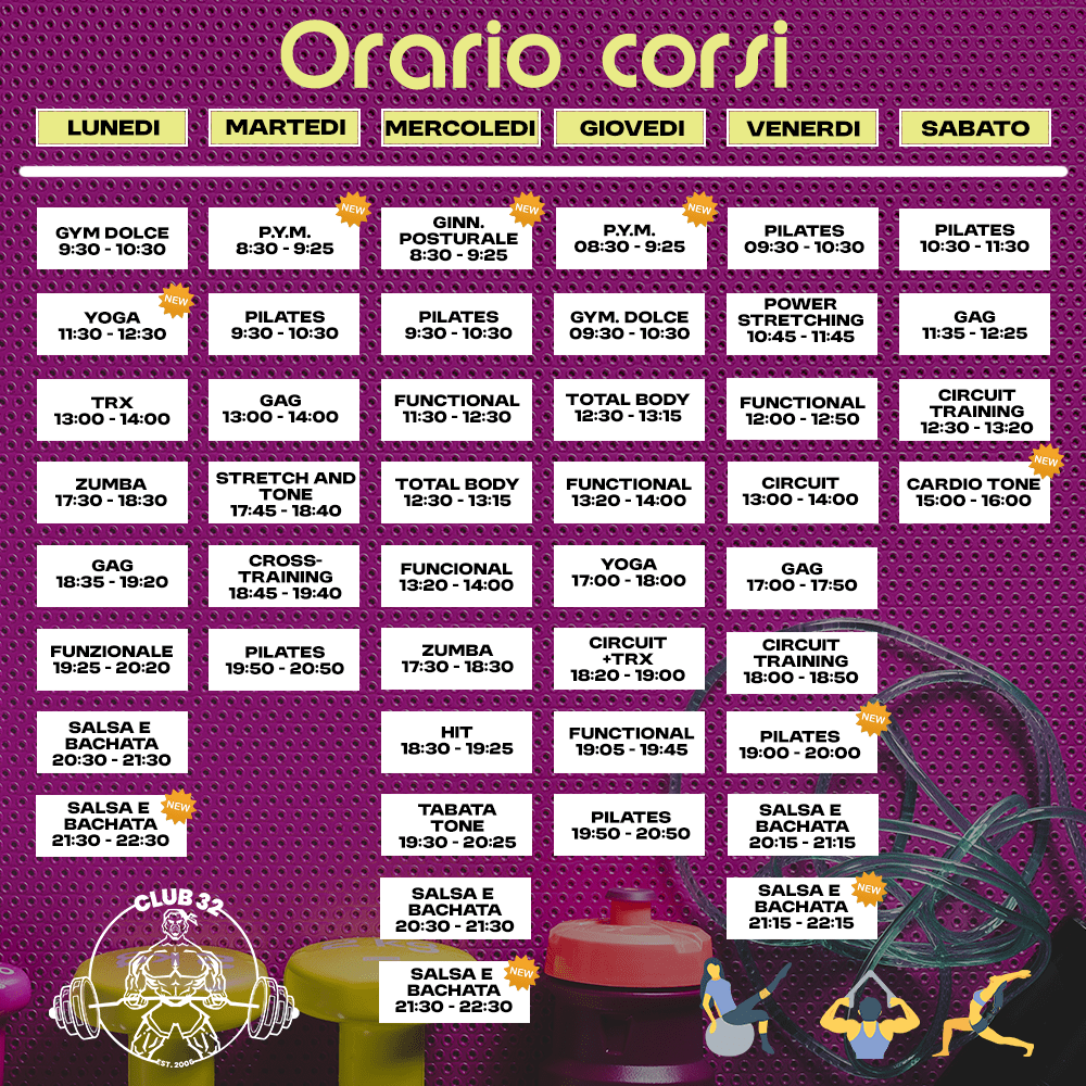 Di seguito puoi consultare l’orario corsi Club 32 aggiornato valido dal 01 Settembre 2025.